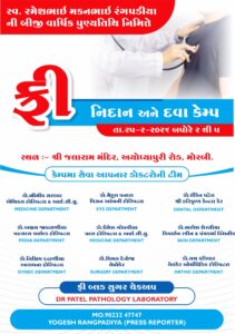 કેમ્પમાં વિવિધ હોસ્પિટલ અને ક્લિનિક સાથે સંકળાયેલા અનુભવી તબીબો દ્વારા સેવા આપવામાં આવશે. જેમાં ડો.ભૌમિક સરડવા (એથિકસ હોસ્પિટલ & ICU- મેડિસિન વિભાગ), ડો.ઉમેશ ગોધવીયા (પલ્સ હોસ્પિટલ & ICU- મેડિસિન વિભાગ), ડો.મેહુલ પનારા (વિઝન આંખની હોસ્પિટલ- આંખ વિભાગ), ડો.ધીરેન પટેલ (શ્રી હરિકૃષ્ણ ડેન્ટલ કેર- ડેન્ટલ વિભાગ), ડો.અક્ષય જાકાસણીયા (વાત્સલ્ય ચાઈલ્ડ હોસ્પિટલ- બાળરોગ વિભાગ), ડો.ભાવેશ શેરસિયા (ડિવાઈન સ્કીન & પંચકર્મા ક્લિનિક- સ્કીન વિભાગ), ડો.નિશિથ દઢાણીયા (આરાધના હોસ્પિટલ- ગાયનેક વિભાગ), ડો.વિમલ દેત્રોજા (લેપ્રોકેર- સર્જરી વિભાગ) તેમજ ડો.યશ કડિવાર (વેલકેર ઓર્થોપેડિક હોસ્પિટલ- ઓર્થો વિભાગ) પોતાની નિષ્ણાત સેવા આપશે. આ ઉપરાંત ડીઆર પટેલ પેથોલોજી લેબોરેટરી દ્વારા નિઃશુલ્ક બ્લડ સુગર ચેકઅપ પણ કરવામાં આવશે. આયોજકોએ વધુમાં વધુ લોકોને આ સેવા કેમ્પનો લાભ લેવા અનુરોધ કર્યો છે. વધુ માહિતી માટે યોગેશ રંગપડીયા(પ્રેસ રિપોર્ટર)ના મો. 90232 47747 પર સંપર્ક કરવા યાદીમાં જણાવ્યું છે.