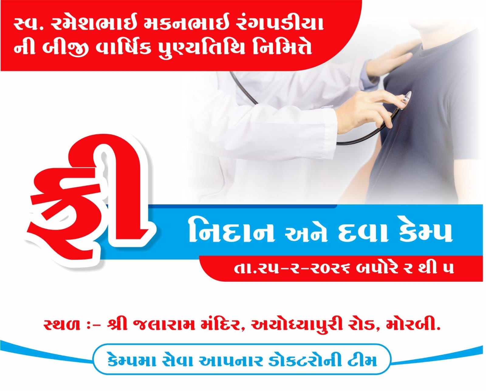 મોરબી: સ્વ.રમેશભાઈ મકનભાઈ રંગપડીયાની બીજી વાર્ષિક પુણ્યતિથિ નિમિત્તે તા.૨૫ ફેબ્રુઆરી ૨૦૨૬ના રોજ બપોરે ૨ થી ૫ દરમિયાન મોરબીના શ્રી જલારામ મંદિર અયોધ્યાપુરી રોડ ખાતે નિઃશુલ્ક નિદાન અને દવા કેમ્પનું આયોજન કરવામાં આવ્યું છે. વિવિધ વિભાગોના નિષ્ણાત ડોકટરો દ્વારા નિઃશુલ્ક તપાસ અને માર્ગદર્શન આપવામાં આવશે તેમજ ફ્રી બ્લડ સુગર ચેકઅપની સુવિધા ઉપલબ્ધ રહેશે.
