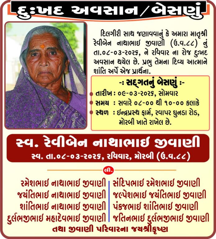 સદગતનું બેસણું તારીખ ૦૯-૦૩-૨૦૨૬ ને સોમવારે સવારે ૦૮-૦૦ થી ૧૦-૦૦ કલાકે ઇન્દ્રપ્રસ્થ ફાર્મ, રવાપર ઘુનડા રોડ મોરબી ખાતે રાખેલ છે.