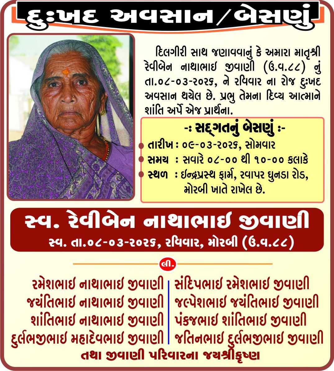 મોરબી નિવાસી રેવીબેન નાથાભાઈ જીવાણીનુ (ઉ.વ. ૮૮) નું તારીખ ૦૮-૦૩-૨૦૨૬ ને રવીવારના રોજ દુઃખદ અવસાન પામેલ છે. પ્રભુ તેમના દિવ્ય આત્માને શાંતિ અર્પે એ જ પ્રાર્થના.