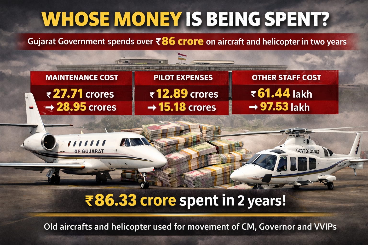 ગુજરાત સરકારની માલિકીના વિમાન અને હેલિકોપ્ટર પાછળ છેલ્લા બે વર્ષ દરમિયાન કુલ રૂ. ૮૬.૩૩ કરોડથી વધુનો ખર્ચ કરવામાં આવ્યો હોવાનું ખુલ્યું છે. રાજ્ય સરકારના સરકારી વિમાન અને હેલિકોપ્ટરના જાળવણી તથા સંચાલન ખર્ચમાં વર્ષ પ્રતિ વર્ષ વધારો થઈ રહ્યો છે.