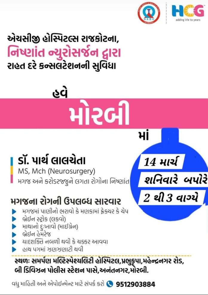 રાજકોટ એચસીજી હોસ્પિટલના નિષ્ણાત ન્યુરોસર્જન ડૉ. પાર્થ લાલચેતા દ્વારા 14 માર્ચે મોરબીમાં ખાસ કન્સલ્ટેશનનુ આયોજન