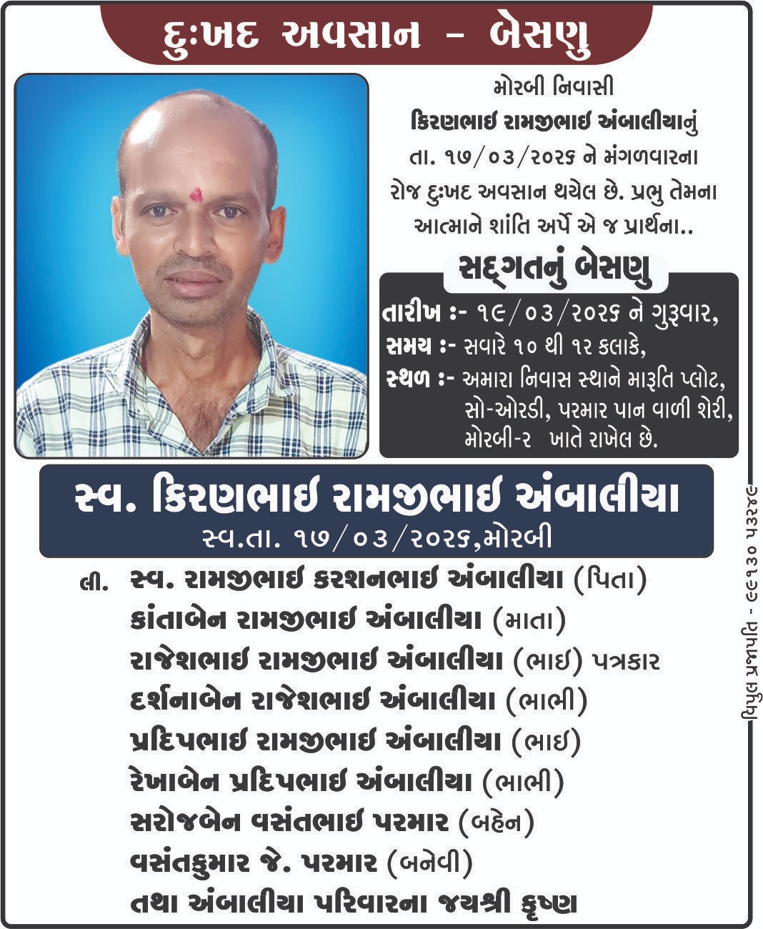 મોરબી : મોરબી નિવાસી કિરણભાઈ રામજીભાઈ અંબાલીયા તે સ્વ. રામજીભાઈ કરશનભાઈ અંબાલીયા અને કાન્તાબેન રામજીભાઈ અંબાલીયાના પુત્ર, સરોજબેન વસંતભાઈ પરમાર, રાજેશ રામજીભાઈ અંબાલીયા (પત્રકાર), પ્રદીપ રામજીભાઈ અંબાલીયાના ભાઈ, દર્શનાબેન અને રેખાબેનના દિયર,વસંતકુમાર જે. પરમારના સાળાનું તારીખ 17-03-2026 ને મંગળવારના રોજ અવસાન થયું છે. સદગતનું બેસણું તારીખ 19-03-2026 ને ગુરુવારના રોજ સવારના 10 થી 12 વાગ્યે તેમના નિવાસ સ્થાન 13, મારુતિ પ્લોટ, સો-ઓરડી, પરમાર પાન વાળી શેરી, મોરબી-2 ખાતે રાખવામાં આવ્યું છે.