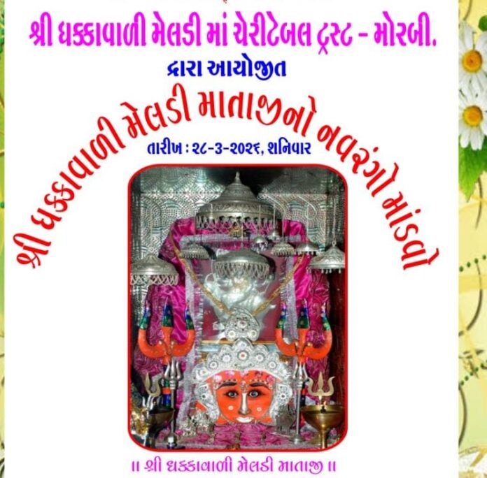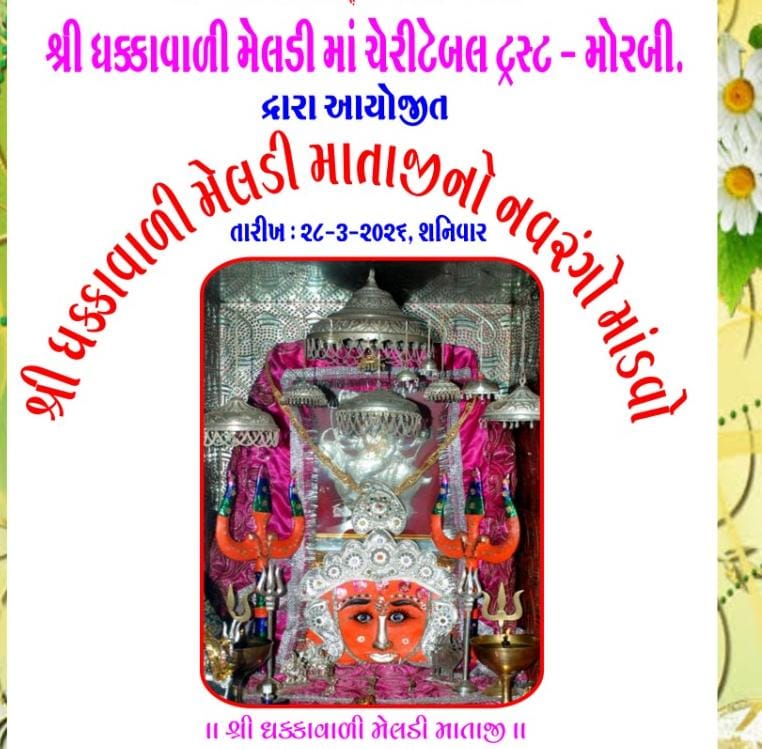 મોરબીના નવલખી રોડ પર રેલવે સ્ટેશન પાસે આવેલા સમગ્ર મોરબી પંથકમાં આસ્થા શ્રધ્ધા પ્રતિક સમાં શ્રી ધક્કાવાળી મેલડી માતાજી નો ભવ્ય નવરંગ માંડવાનું આયોજન શ્રી ધક્કાવાળી મેલડી માં ચેરીટેબલ ટ્રસ્ટ મોરબી દ્વારા તા. ૨૮/૩/૨૬ શનિવારે યોજાશે જેમાં વિવિધ પ્રસંગો આ મુજબ યોજાશે.