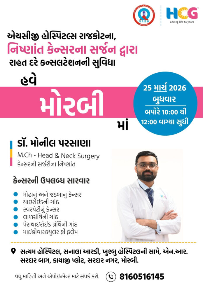 મોરબીમાં રહેતા દર્દીઓ માટે સારા સમાચાર છે. રાજકોટની એચસીજી હોસ્પિટલના નિષ્ણાત કેન્સર સર્જન દ્વારા મોરબીમાં રાહતદરે કેન્સર કન્સલ્ટેશનનુ આયોજન કરવામાં આવ્યું છે. આ કન્સલ્ટેશમા માથા અને ગળાના કેન્સર સહિત વિવિધ પ્રકારના કેન્સરની તપાસ અને માર્ગદર્શન આપવામાં આવશે.