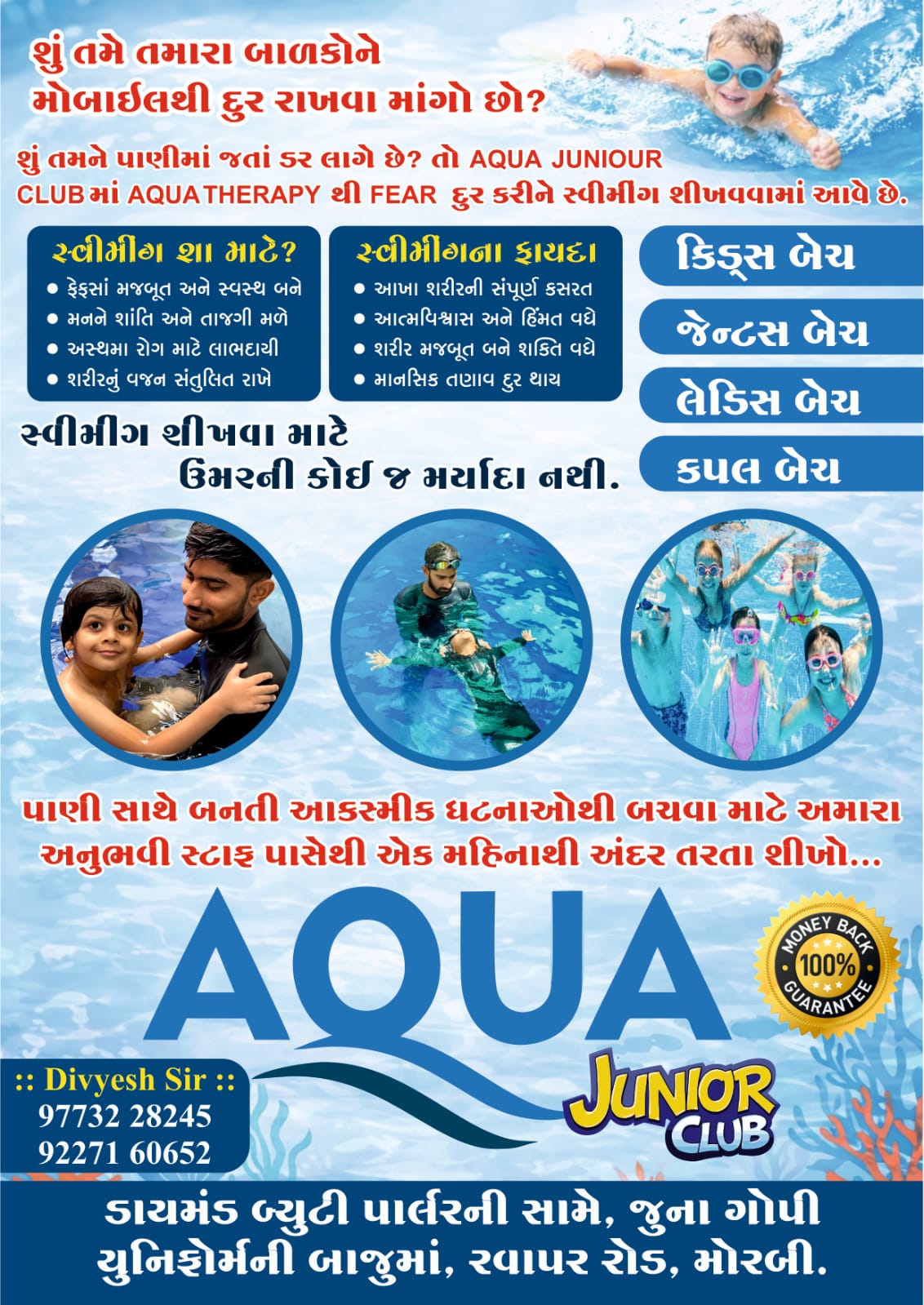 AQUA JUNIOR CLUB મોરબીના રવાપર રોડ પર સ્થિત ડાયમંડ બ્યુટી પાર્લરની સામે જુના ગોપી યુનિફોર્મ પાસે આવેલ છે. તેમજ આ ક્લબમાં નોંધણી માટે રસ ધરાવતા લોકોએ મોબાઈલ નંબર – 9773228245, 9227160652 પર સંપર્ક કરી વધુ માહિતી મેળવી શકે છે.