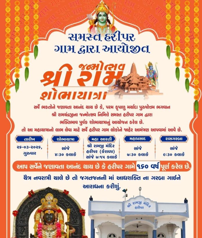 મોરબીના હરિપર ગામ દ્વારા ભગવાન શ્રી રામચંદ્રજીના જન્મોત્સવ નિમિત્તે ભવ્ય શોભાયાત્રા અને વિવિધ ધાર્મિક કાર્યક્રમોનું આયોજન કરવામાં આવ્યું છે.