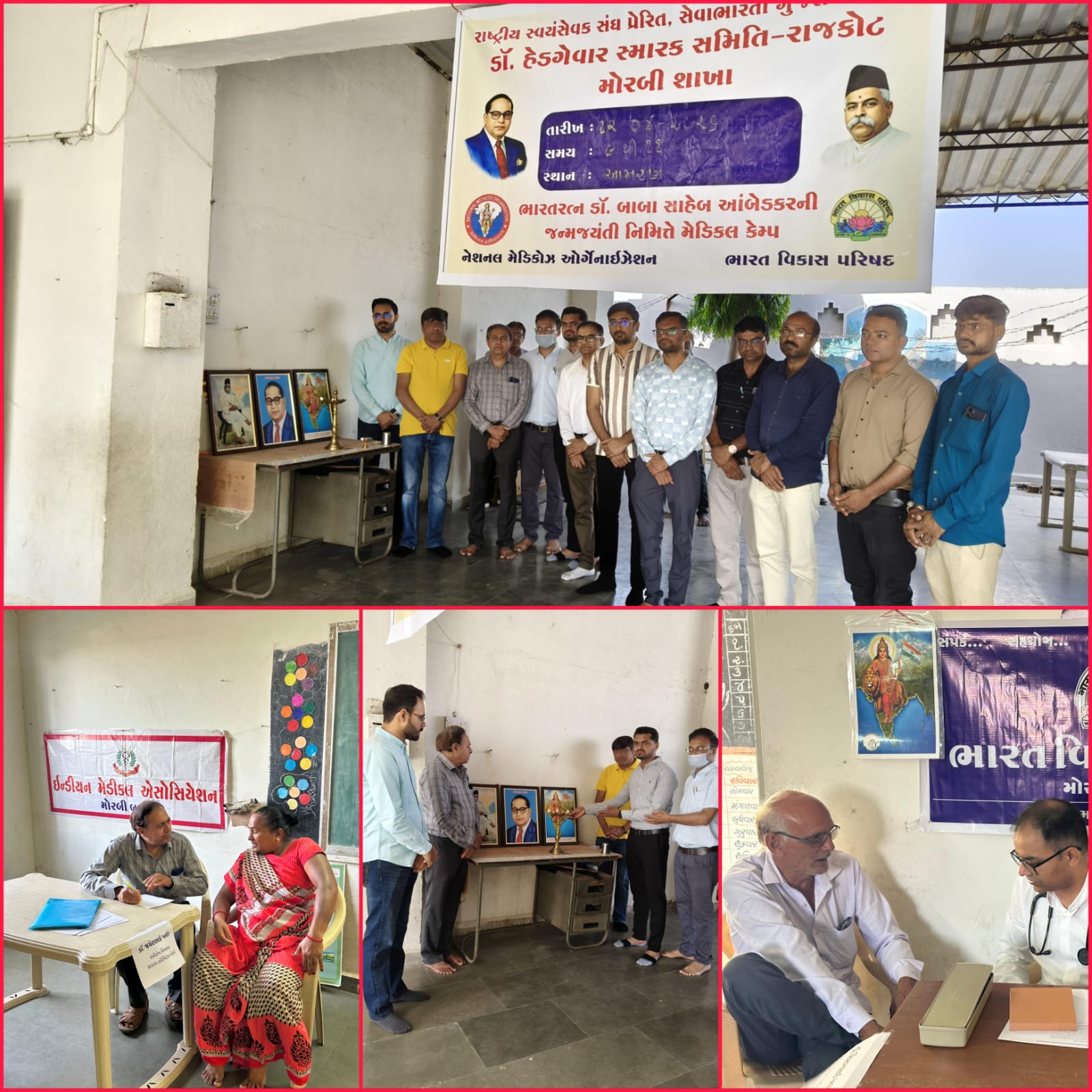 આજે ભારત વિકાસ પરિષદ-મોરબી, રાષ્ટ્રીય સ્વયંસેવકસંઘ, સેવા ભારતી-ગુજરાત તથા ડૉ. હેડગેવાર સ્મારક સમિતિના સંયુક્ત ઉપક્રમે ડૉ. બાબાસાહેબ આંબેડકર જયંતિ નિમિત્તે આમરણ ગામ ખાતે “નિઃશુલ્ક મેડિકલ કેમ્પ” નું આયોજન કરવામાં આવેલ હતું .